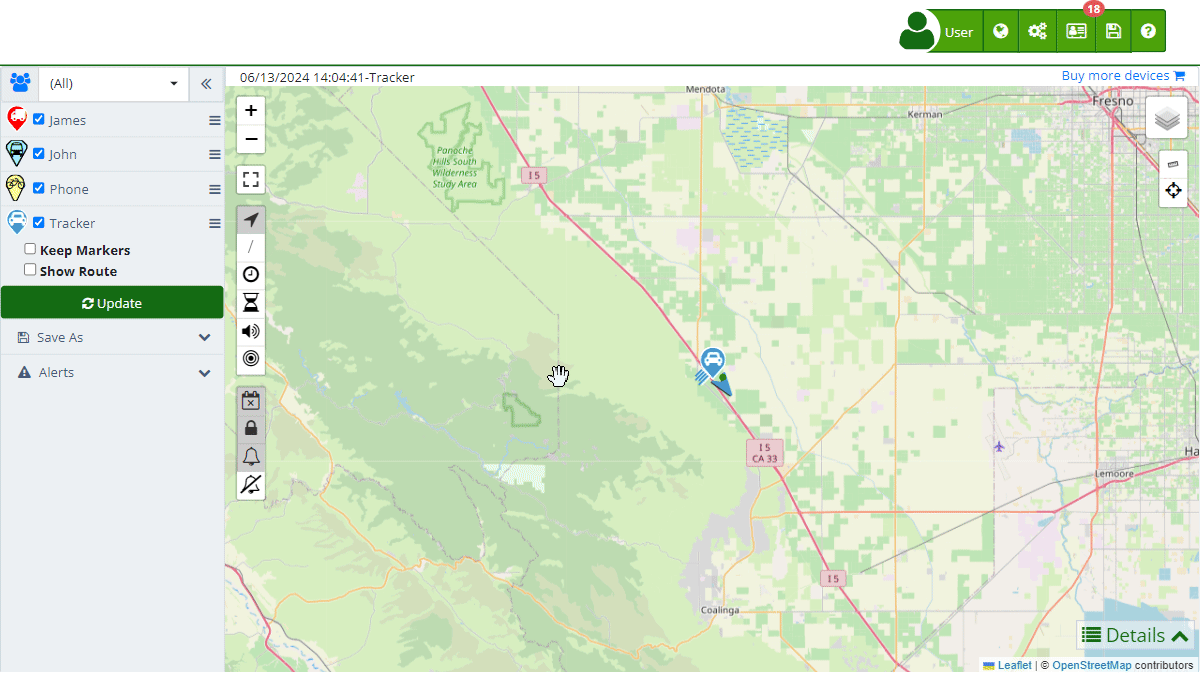 - Description: Shows the route taken by the device during the selected period. Points on the map indicate stops.