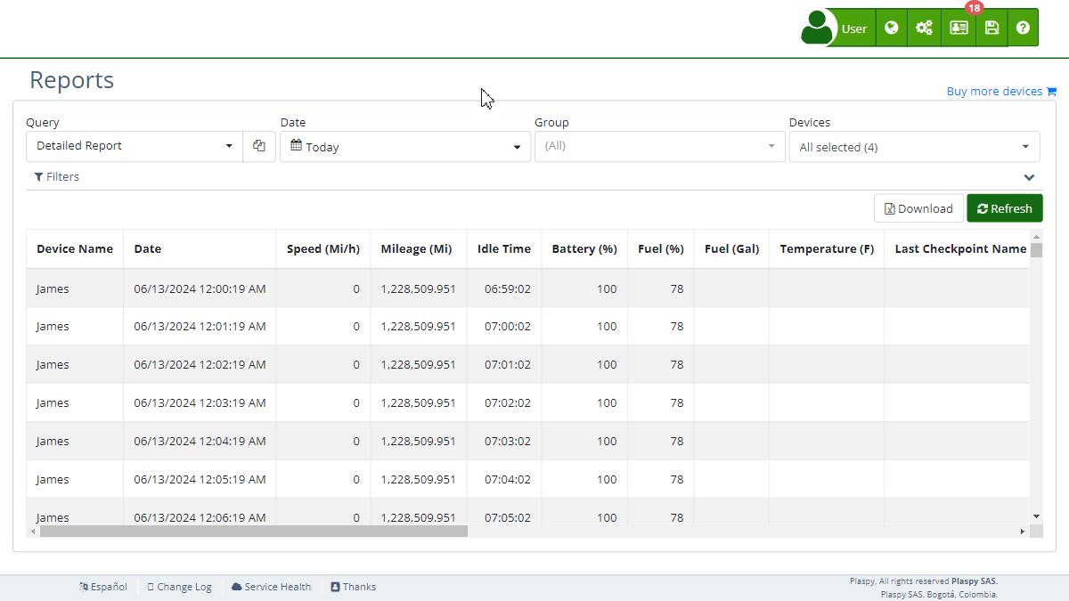 - Standard: This type of report is commonly used on the map for map details or to apply filters when querying a route. It provides a detailed and precise view of the behavior and location of the fleet in real-time. Each record represents a specific location of an asset, providing data such as instantaneous speed, geographical coordinates, and the exact time of the record. It is ideal for users who need exhaustive tracking and meticulous recording of the activities of each vehicle or asset in their daily operations.