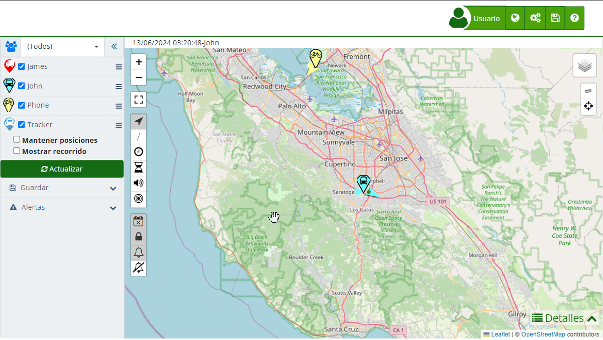 - Mostrar recorrido: Marca la opción "Mostrar recorrido" y haz clic en el botón "Actualizar" para visualizar la ruta en el mapa.
