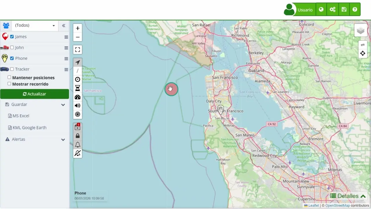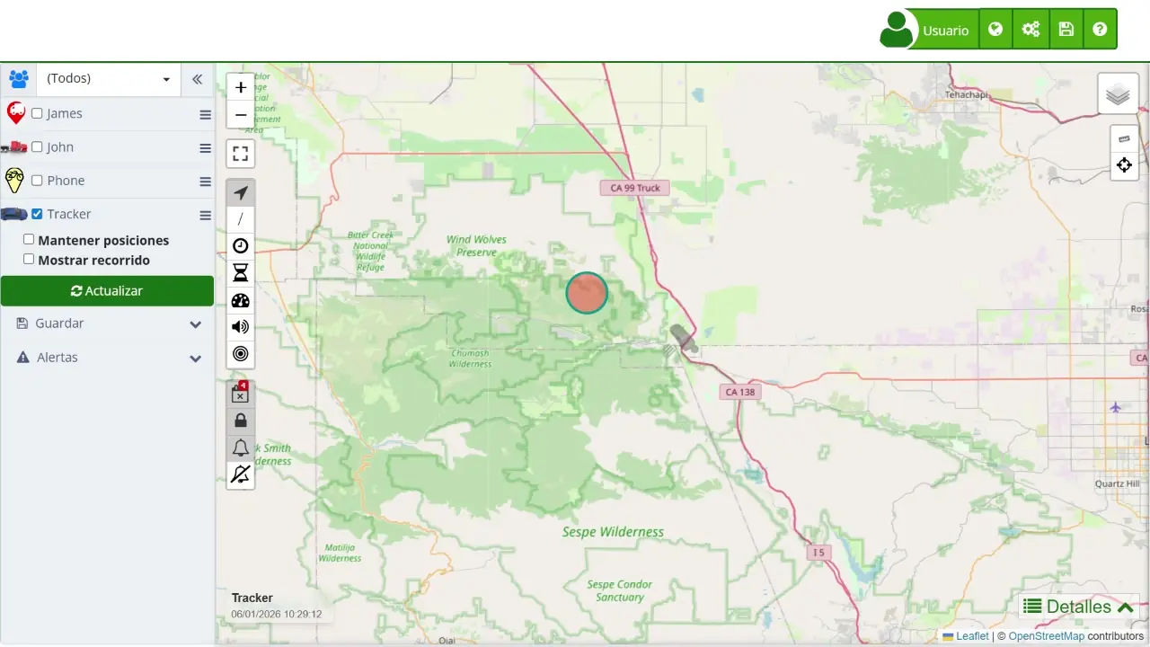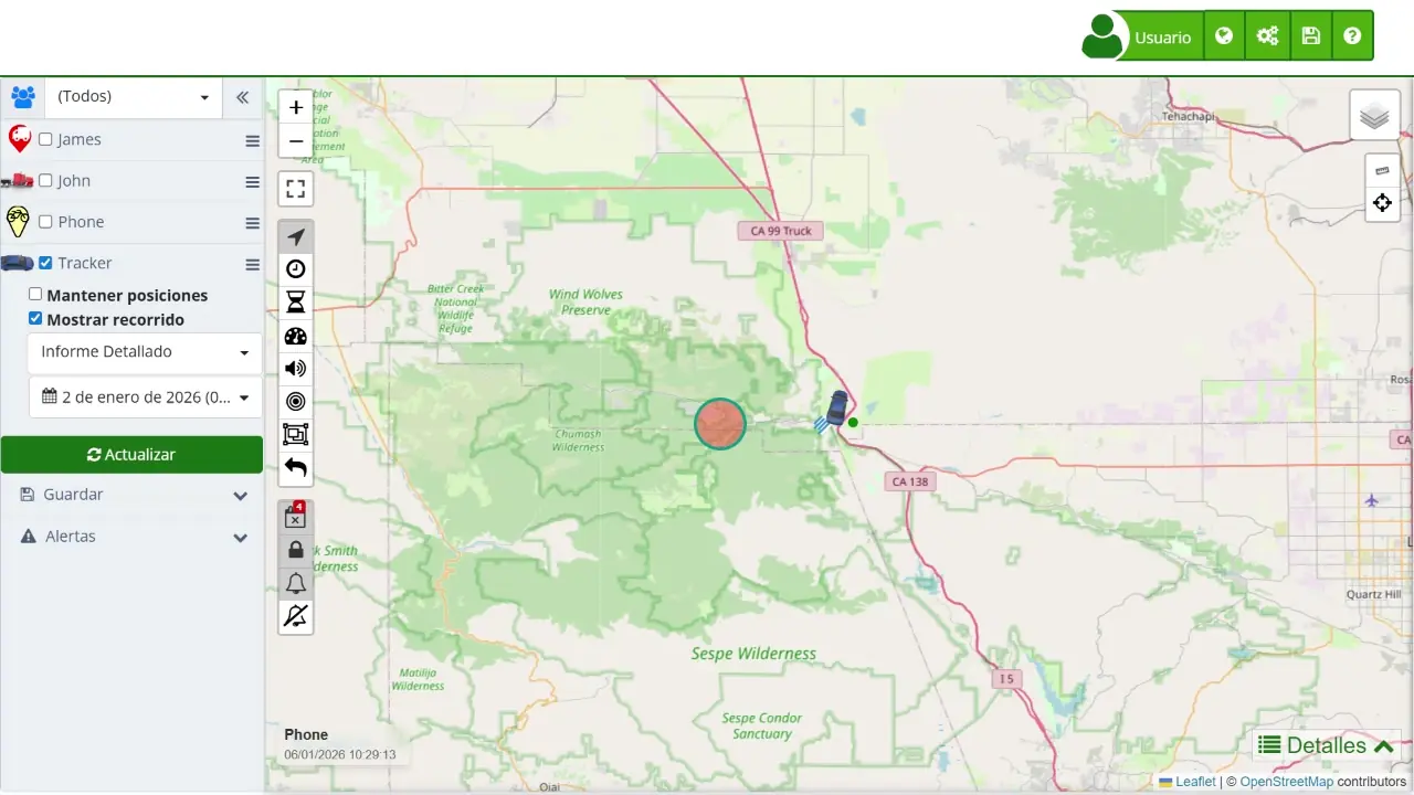 - / Rastro Permite mostrar u ocultar el rastro histórico de un dispositivo, mostrando su recorrido pasado. Esto es útil para analizar movimientos históricos, detectar patrones de desplazamiento y revisar rutas completadas para optimizar la planificación de futuras rutas.