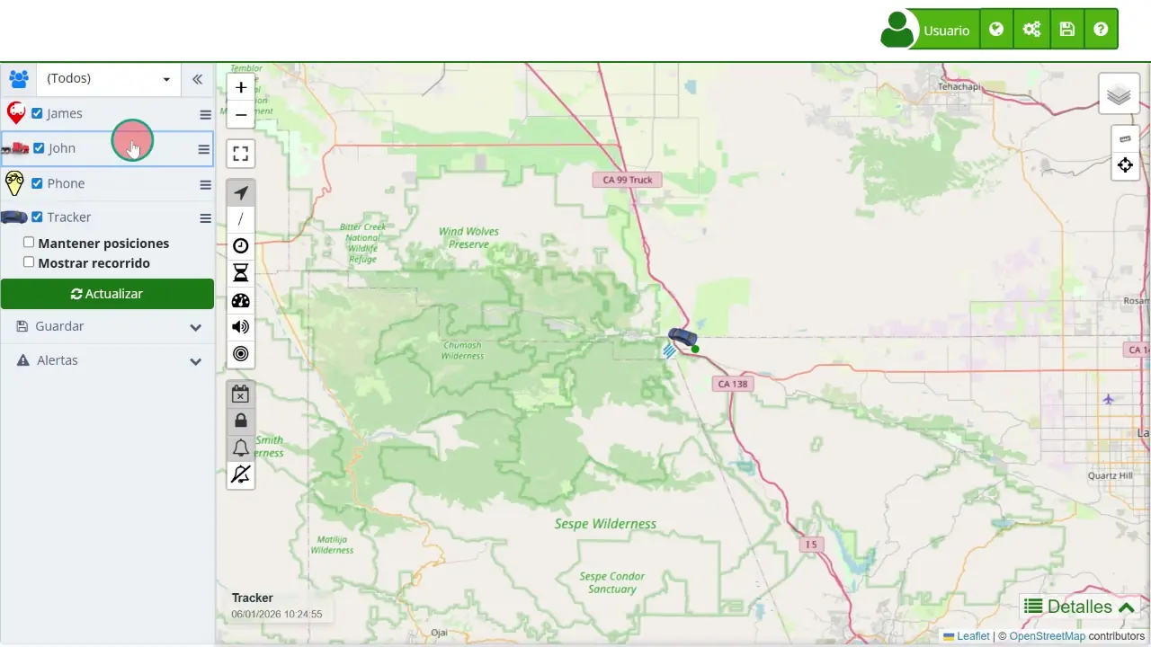 - Seleccionar Dispositivos: En el panel izquierdo, seleccione el dispositivo o los dispositivos cuyos recorridos desea ver. Puede elegir un dispositivo específico o varios dispositivos simultáneamente. Use las casillas de verificación junto a cada dispositivo para hacer su selección.