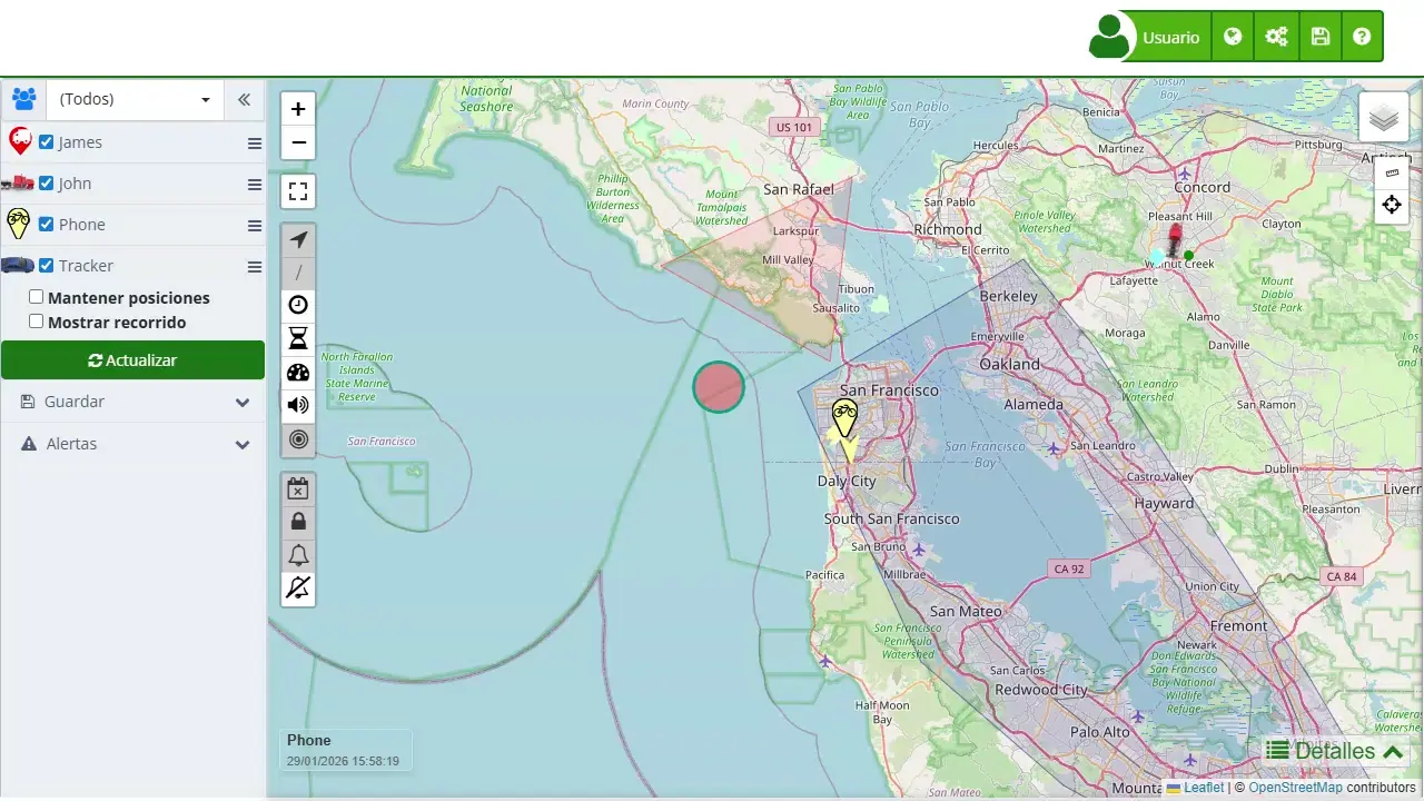 - **Rastrear teléfonos:**Permite al usuario ver la ubicación y el recorrido de todos los teléfonos asignados dentro de la plataforma.